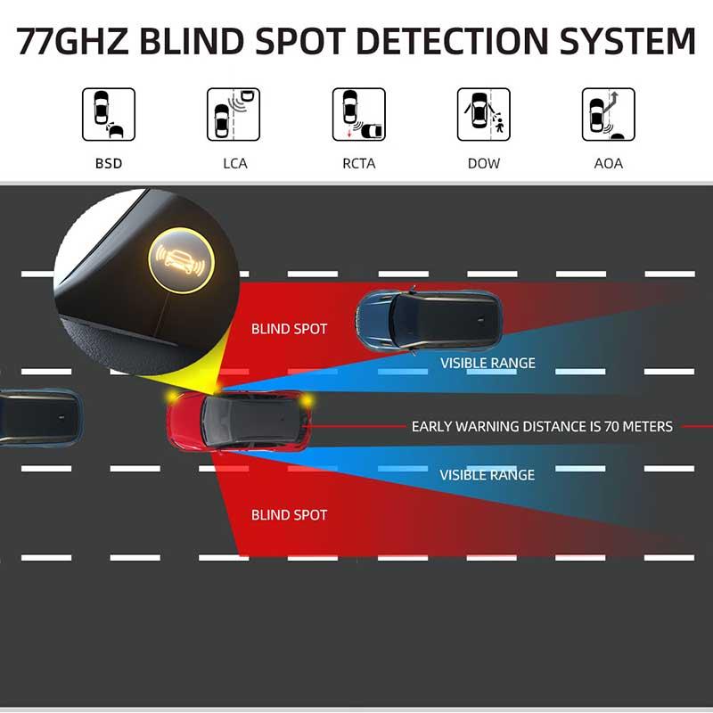 بتركيب مسبار رادار داخل المصد الخلفي للسيارة، ترصد مجسات الرادار النقاط العمياء على جانبي السيارة بشكل مستمر وشامل. ولضمان قيادة آمنة بمساعدة السائق، زُوّد المصد الخلفي بمسباري رادار بتردد 77 جيجاهرتز بموجة مليمترية. عند استعداد السيارة لتغيير مسارها ووجود سيارات أو مشاة ضمن نطاق النقاط العمياء، يُصدر جرس السيارة إنذارًا فورًا لتحذير السائق بتغيير مساره بحذر، مما يقلل من احتمالية وقوع حوادث مرورية ويحقق القيادة الآمنة بمساعدة السائق.